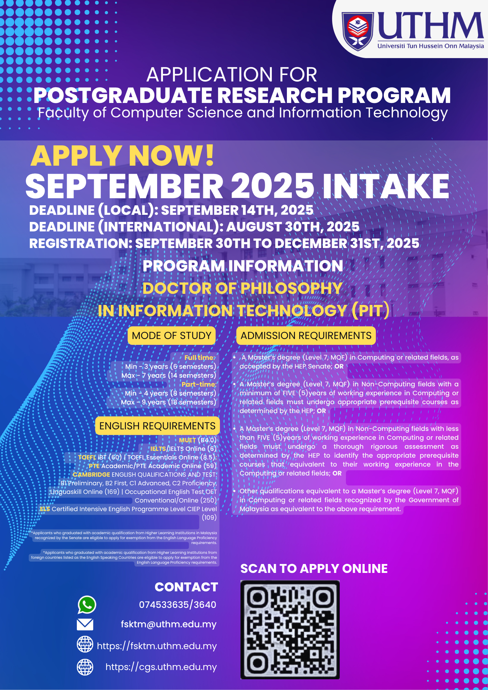 Doctor of Philosophy in Information Technology (PIT) programme offers flexible study modes to suit different needs. It is a research degree by thesis under the supervision of experienced members of academic staff or a supervisory panel. For full-time students, the minimum duration of study is 3 years, equivalent to 6 semesters, while the maximum duration allowed is 7 years, or 14 semesters. For part-time students, the programme can be completed in a minimum of 4 years, spanning 8 semesters, and must be completed within a maximum of 9 years, which covers 18 semesters.